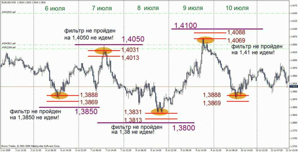 Это график М-30. Лучше было бы, конечно, рассмотреть часовой график, но тогда было бы не так красиво - день на графике был бы слишком узким. Давайте пробежимся и глянем, как банки котировали рынок внутри дня. Итак, шестого июля рынок не прошел ниже нижнего котировочного фильтра 39-й фигуры (1,3888...1,3869), что дало основание для роста на следующий день. Седьмого июля рынок не прошел дальше котировочного фильтра 40-ой фигуры (1,4013...1,4031), что означает, что сегодня на 1,4050 (и, тем более, на 1,4100) котировать не будут. Восьмого июля на конец дня не был пройден верхний фильтр 38-ой фигуры (1,3813...1,3831). Девятого июля рынок не закрылся выше нижнего фильтра 41-ой фигуры (какой тут рост к 1,42!). Ну, и десятого июля рынок не перекотировали ниже нижнего фильтра 39-ой фигуры, что означает, что 1,3900 сегодня мы не увидим.