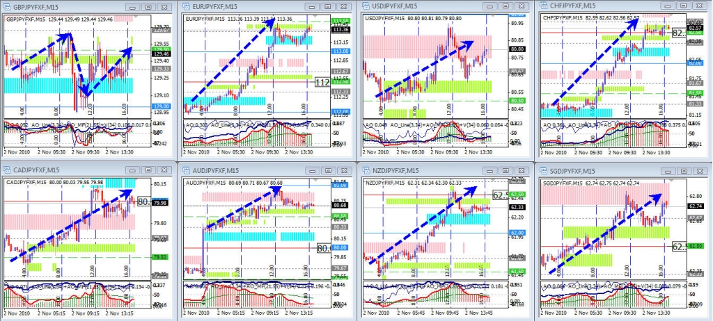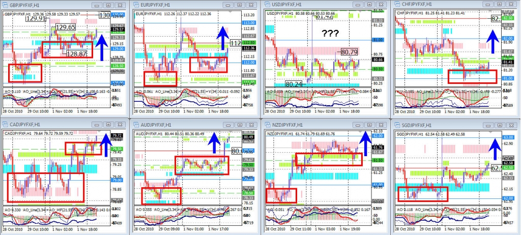 Прогноз оправдался, и все пары, кроме GBP/JPY, прошли один-полтора-два уровня с шагом в 50 пунктов; удивила пара USD/JPY – поддержала компанию, а GBP/JPY, из-за того что нарисовала «палочку» в 90 пунктов первого ноября, устроила флет, так и не дойдя до этого пика.