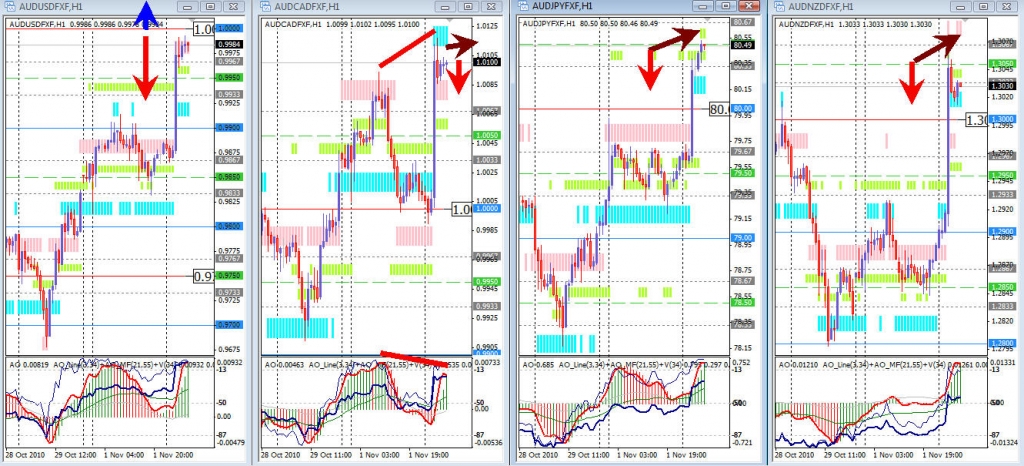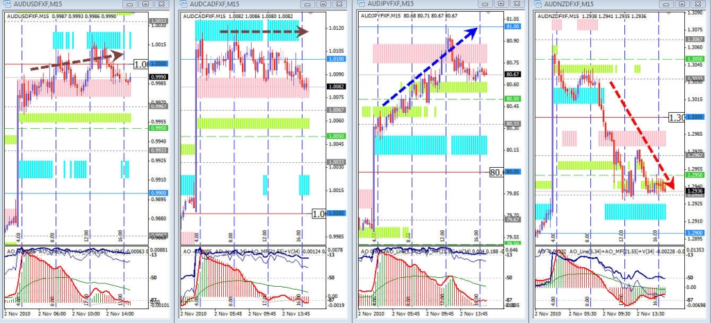 В основном был флет, кроме AUD/NZD, а в паре AUD/JPY цена все-таки достигла уровень 81.00 (почти - не дотянула на 1 пункт), а пара AUD/NZD пока выбрала дорогу вниз.